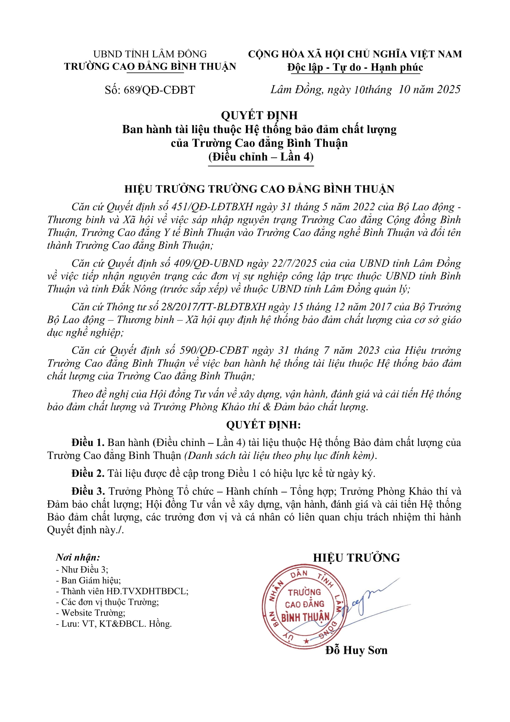 Quyết định Ban hành tài liệu thuộc Hệ thống bảo đảm chất lượng của Trường Cao đẳng Bình Thuận (Điều chỉnh – Lần 4), Năm 2025