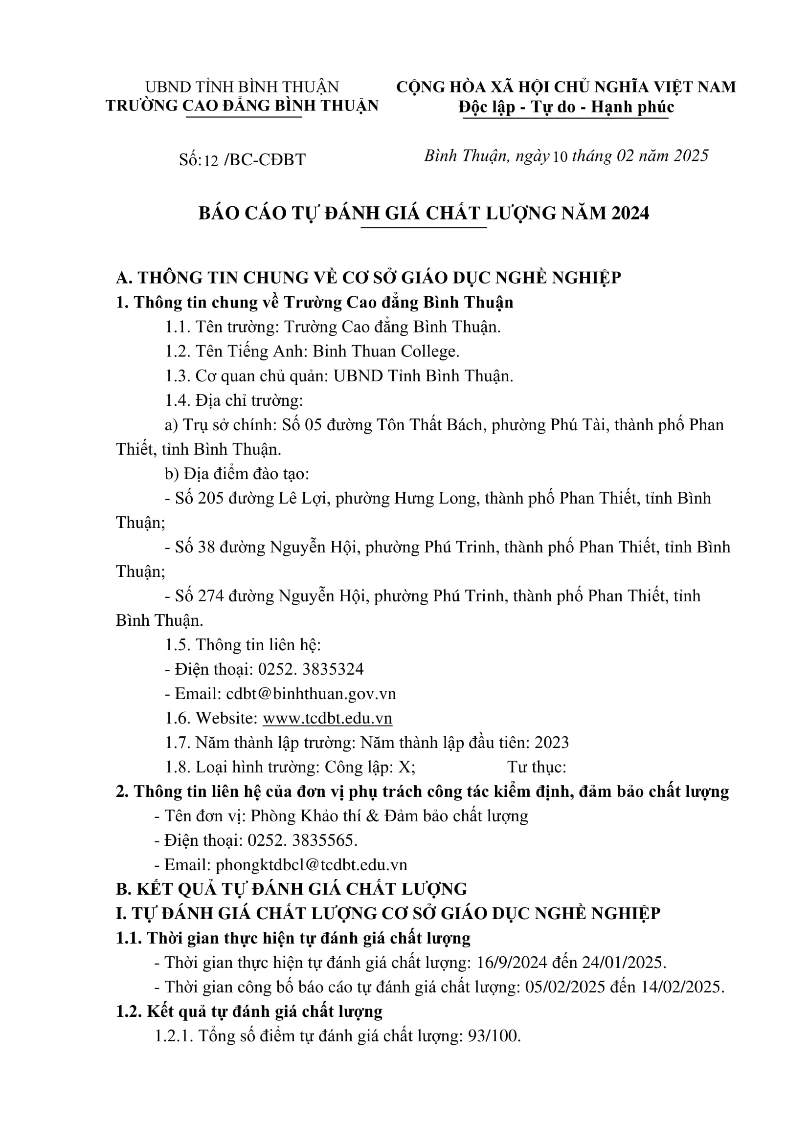 BÁO CÁO TỰ ĐÁNH GIÁ CHẤT LƯỢNG NĂM 2024
