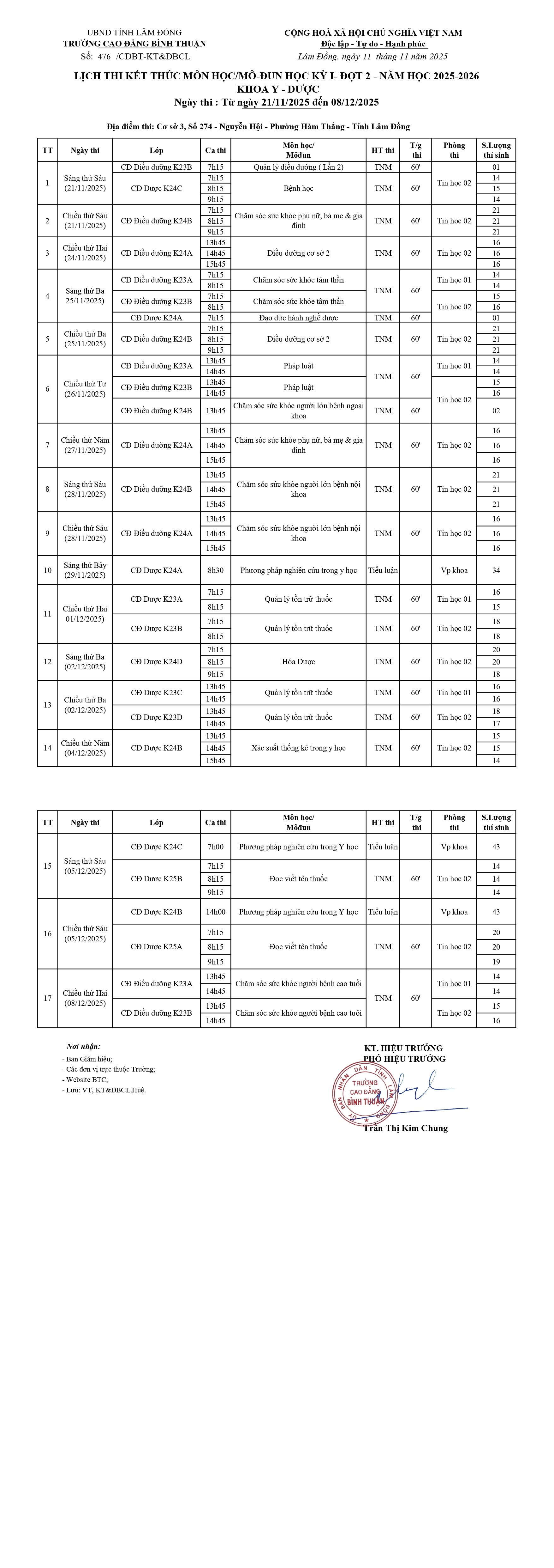 LỊCH THI KẾT THÚC MÔN HỌC/MÔ-ĐUN HỌC KỲ I- ĐỢT 2 - NĂM HỌC 2025-2026 KHOA Y - DƯỢC, Từ ngày 21/11/2025 đến 08/12/2025