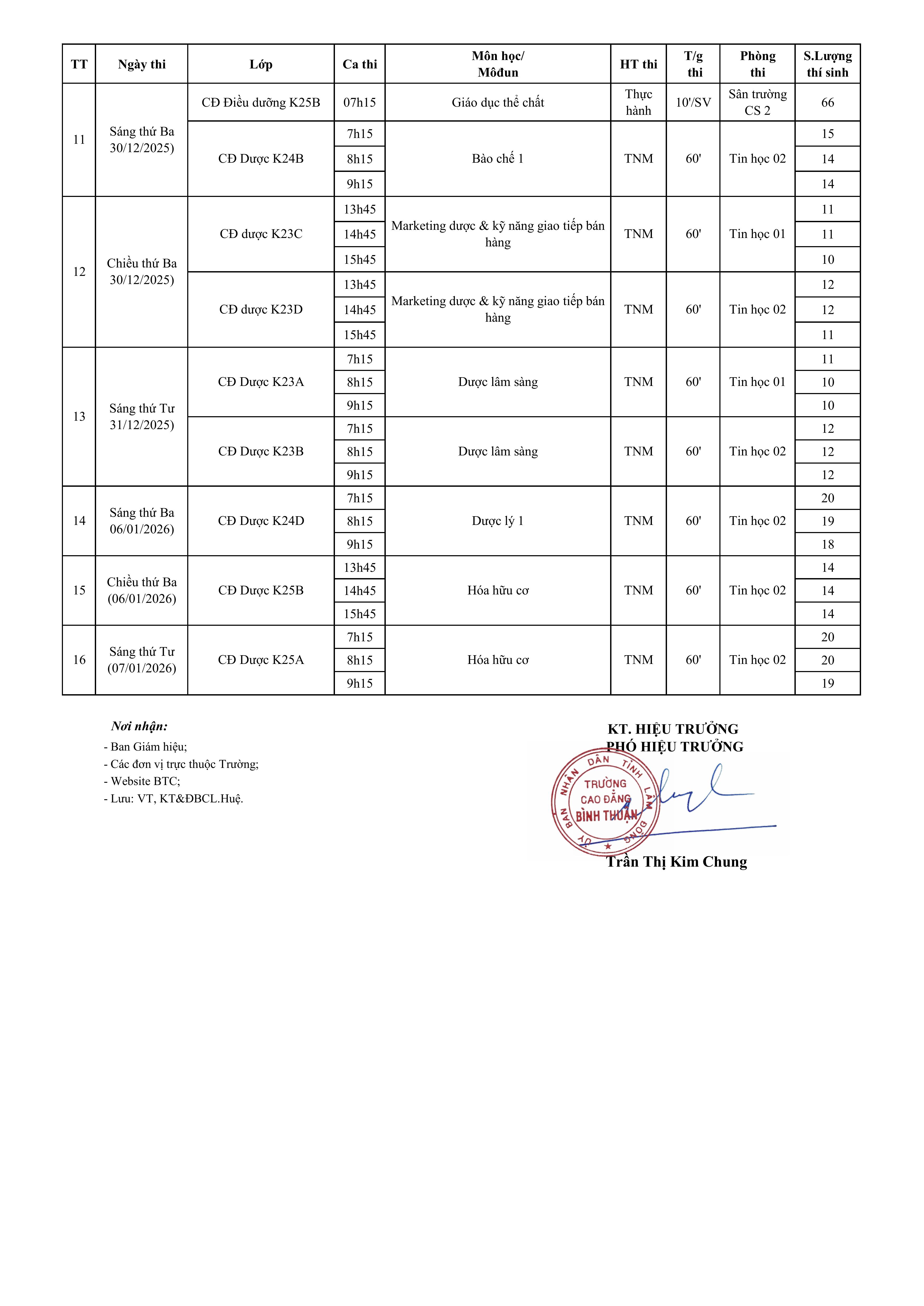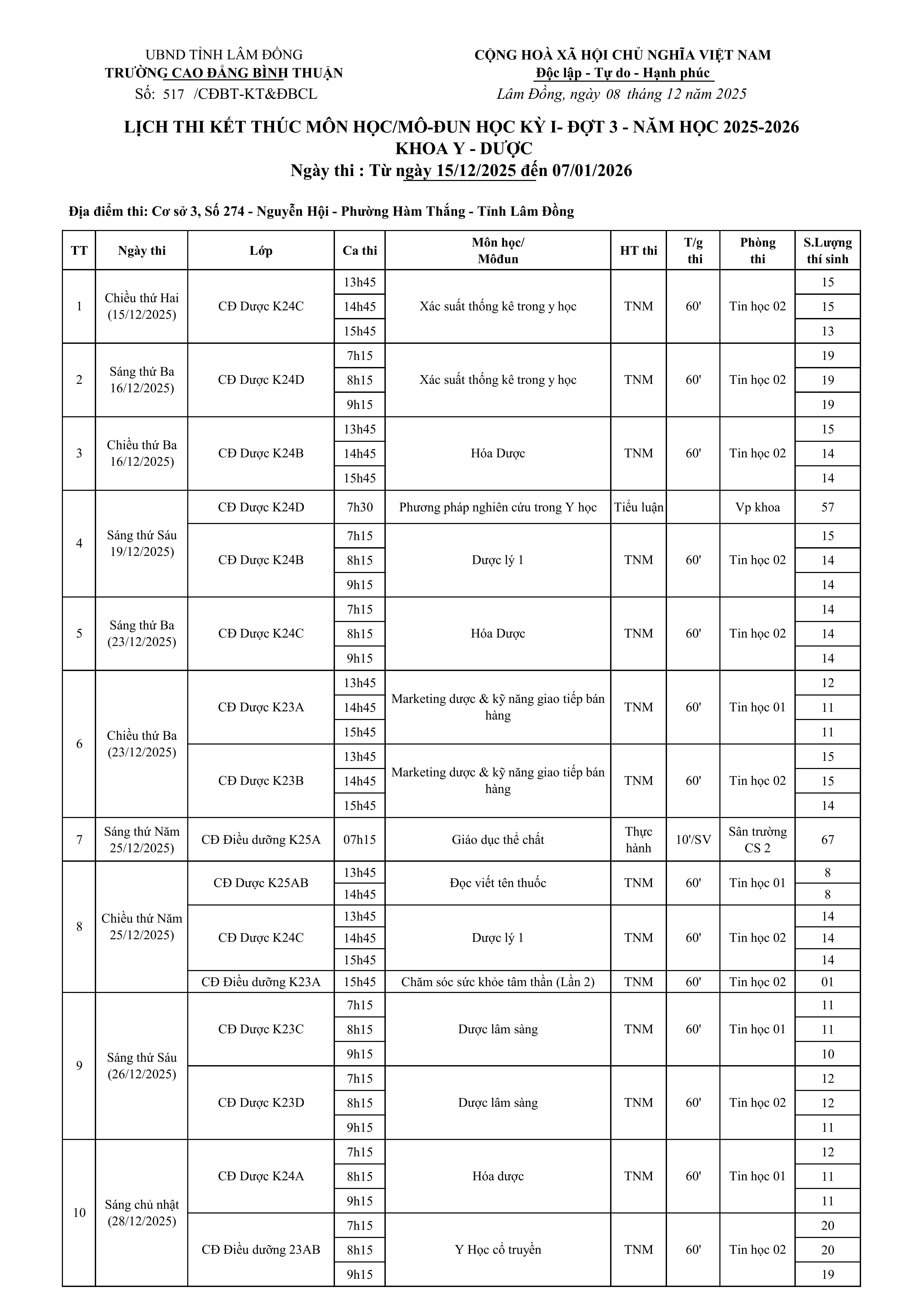 LỊCH THI KẾT THÚC MÔN HỌC/MÔ-ĐUN HỌC KỲ I- ĐỢT 3 - NĂM HỌC 2025-2026 KHOA Y - DƯỢC Ngày thi : Từ ngày 15/12/2025 đến 07/01/2026