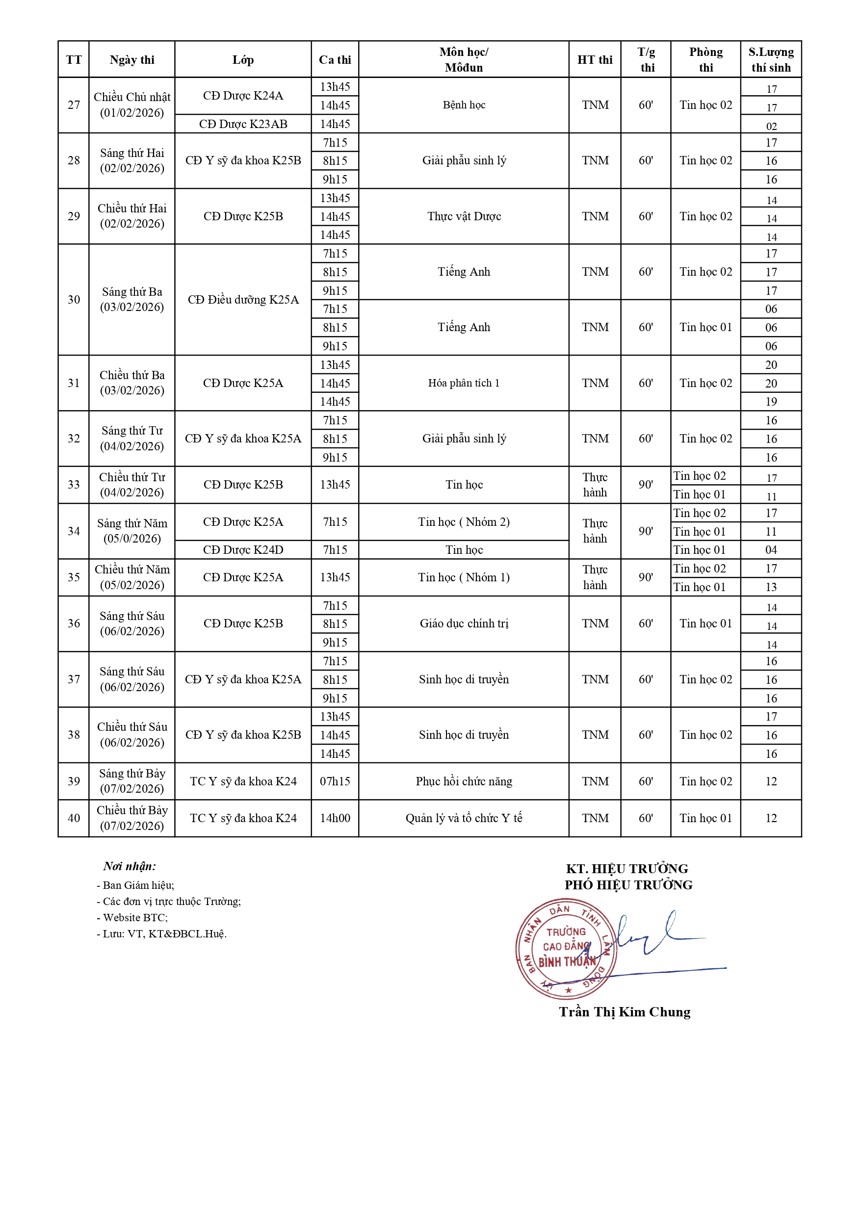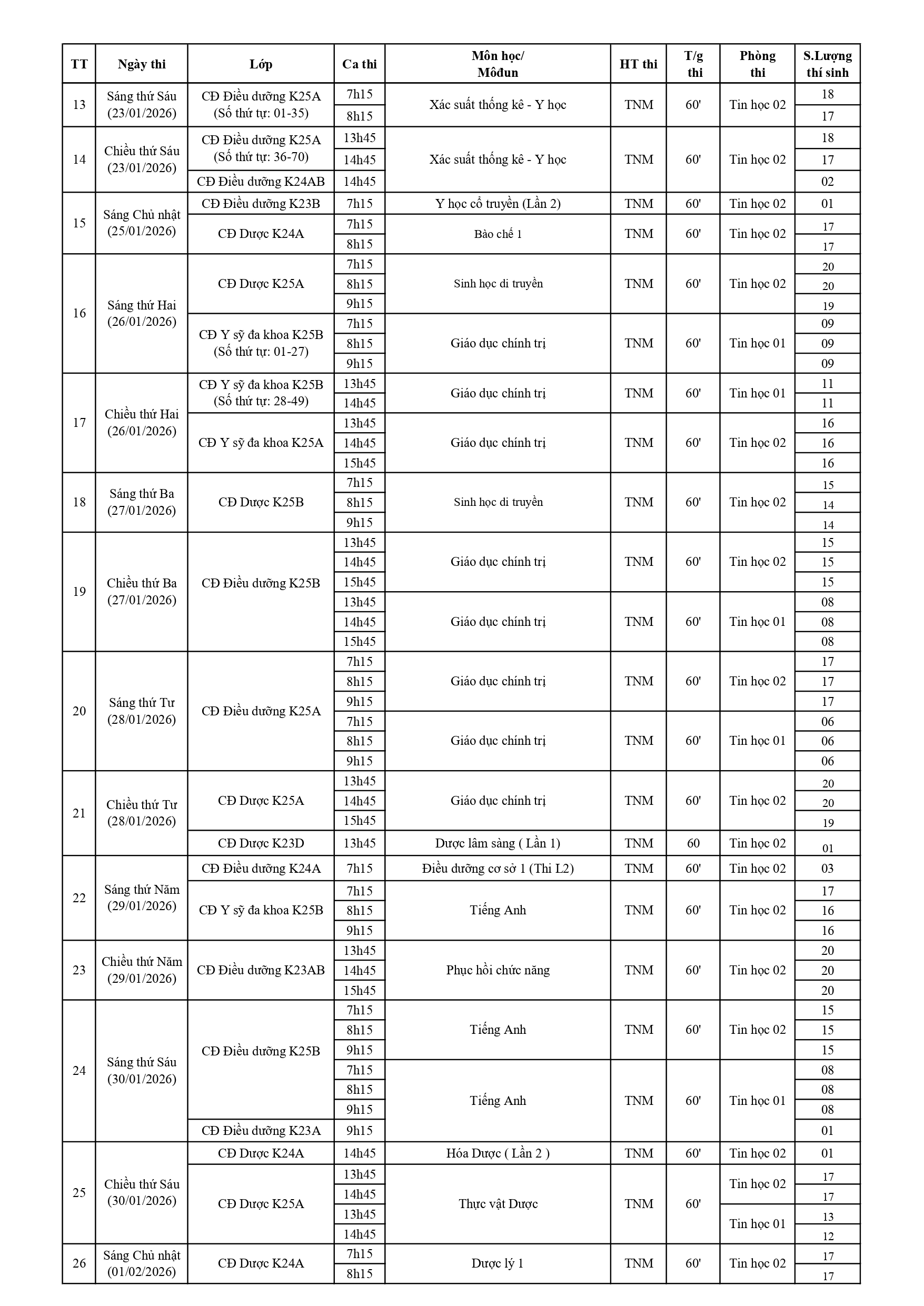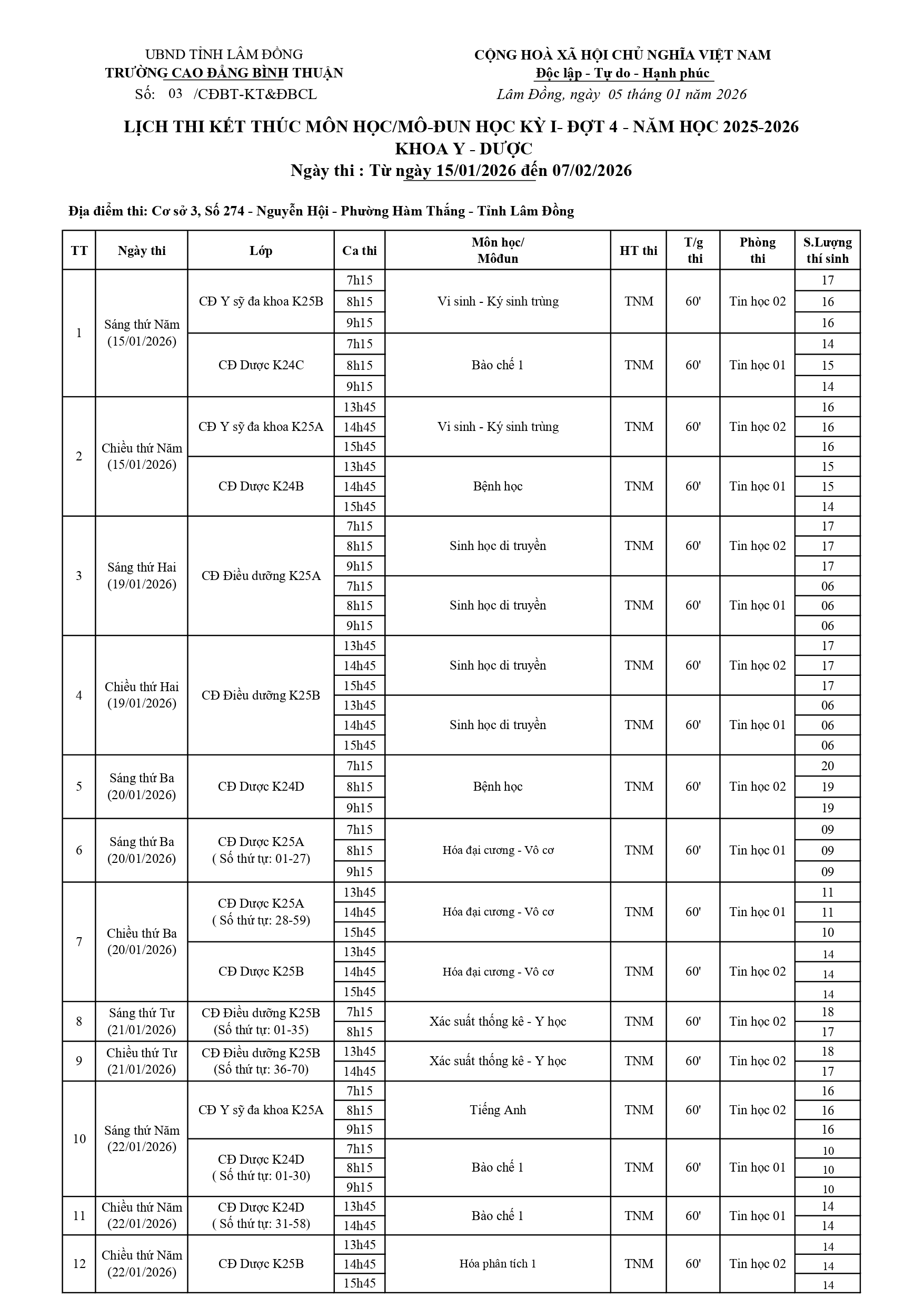 LỊCH THI KẾT THÚC MÔN HỌC/MÔ-ĐUN HỌC KỲ I- ĐỢT 4 - NĂM HỌC 2025-2026 KHOA Y - DƯỢC (Từ ngày 15/01/2026 đến 07/02/2026)