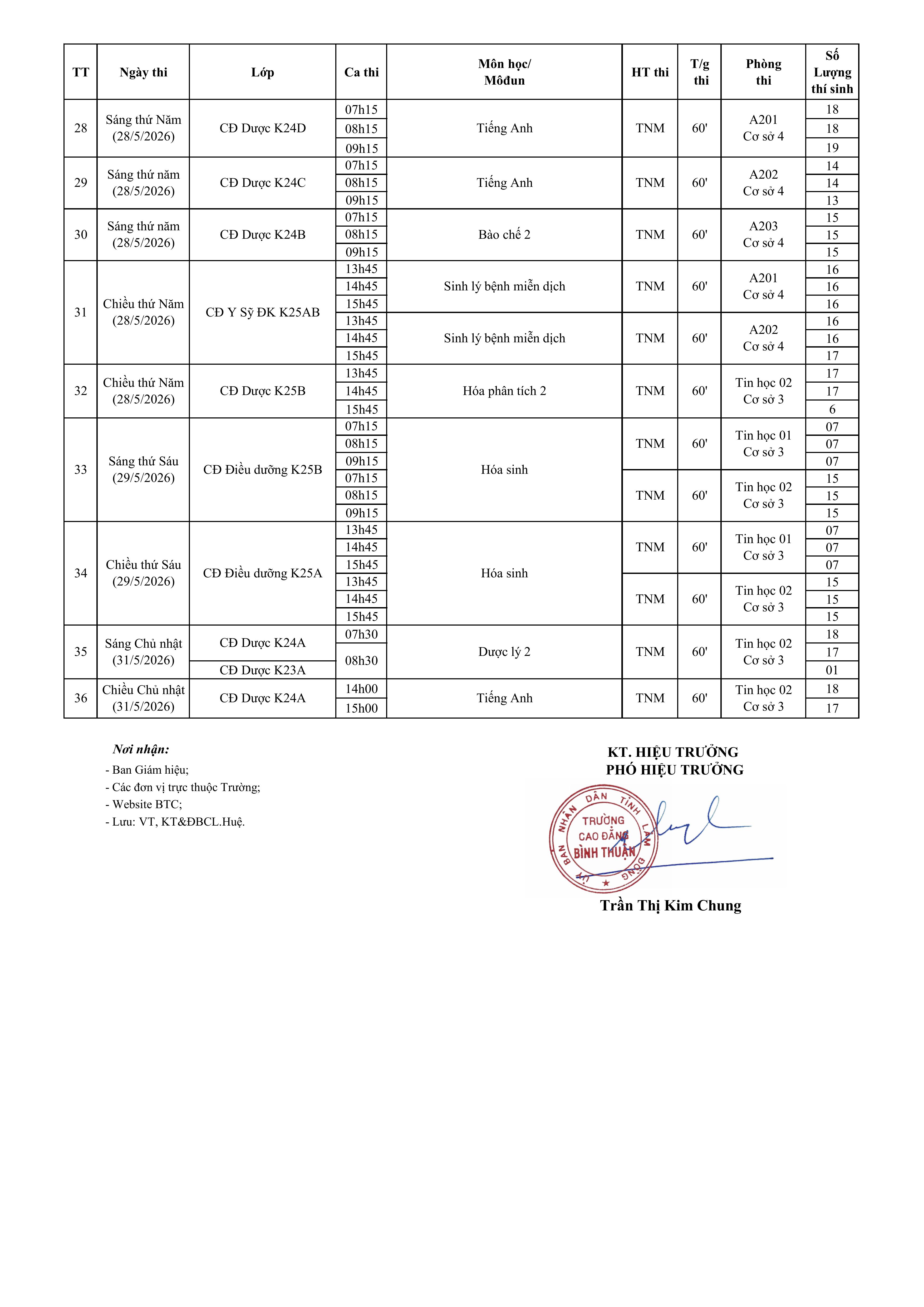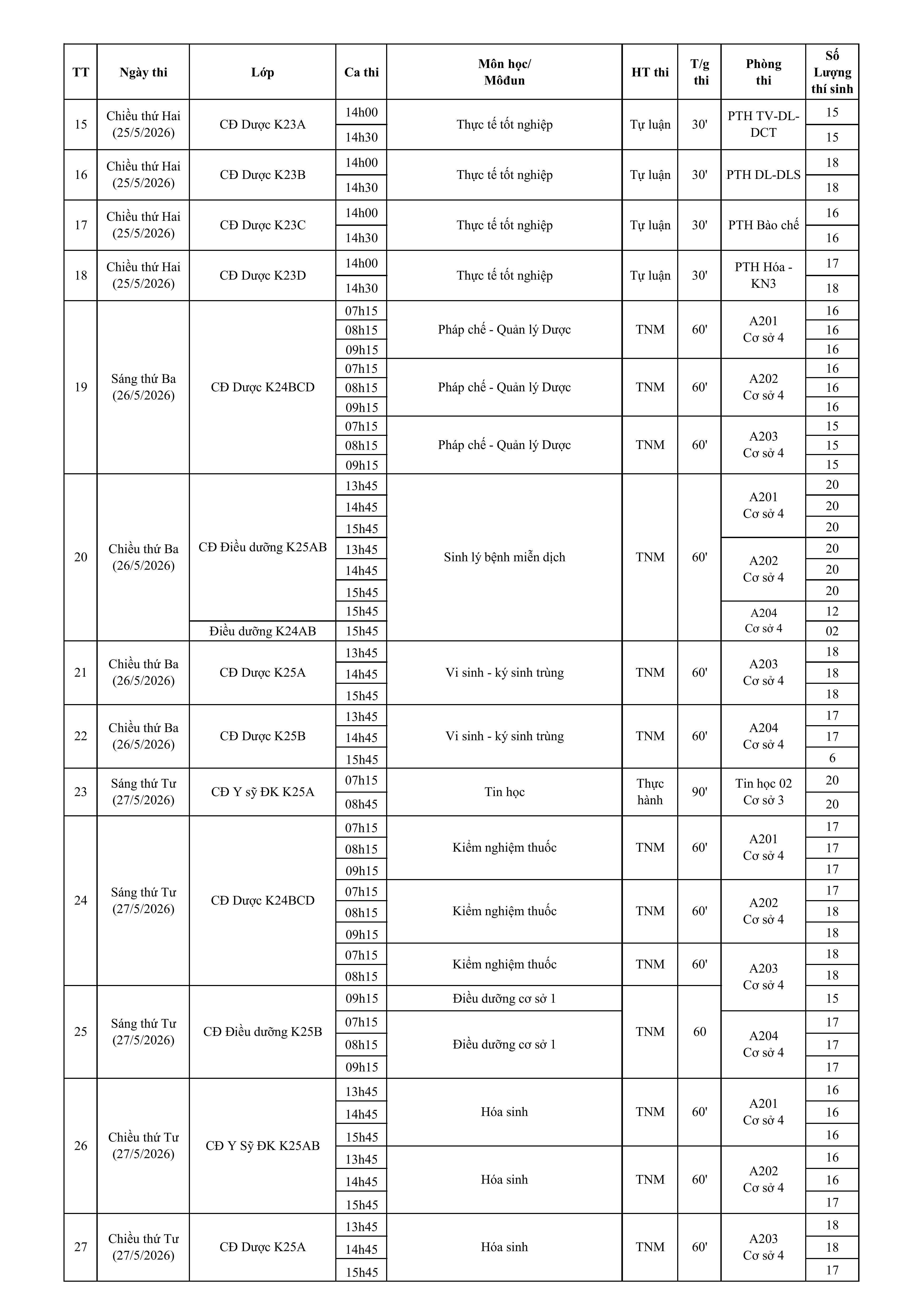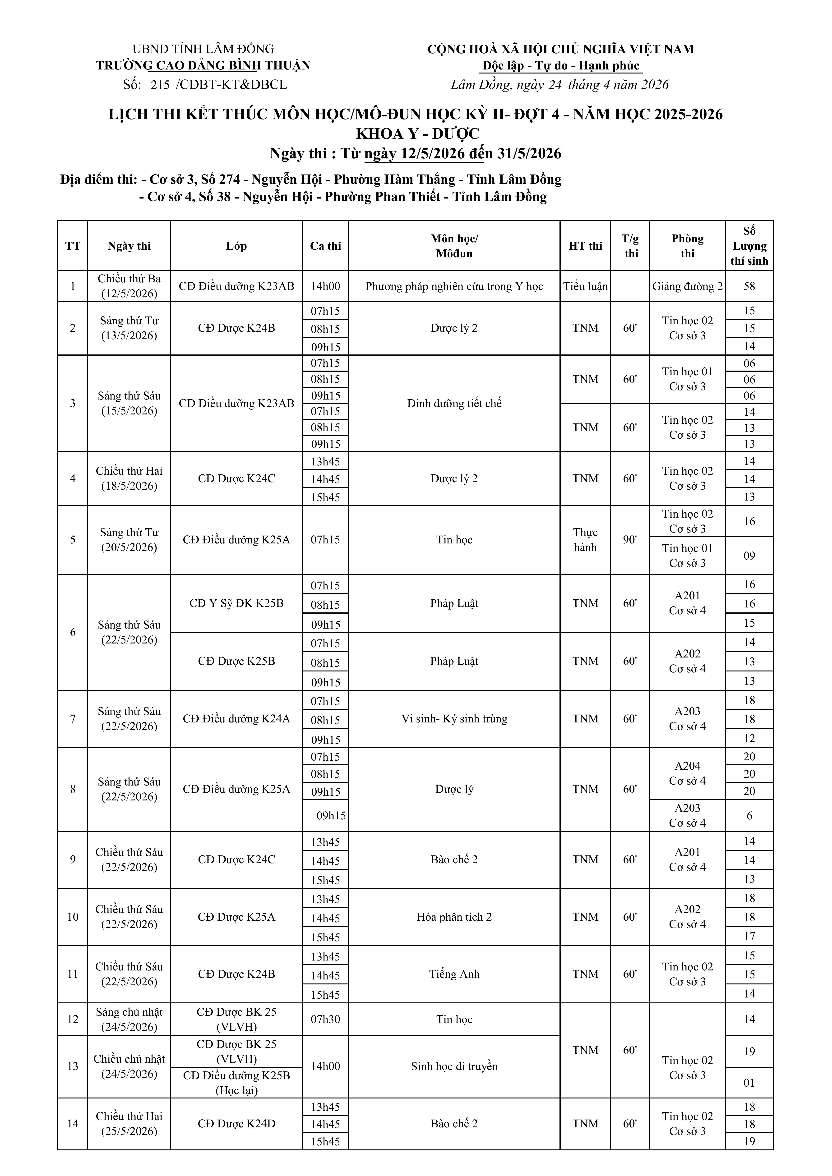(LỊCH THI KẾT THÚC MÔN HỌC/MÔ-ĐUN HỌC KỲ II- ĐỢT 4 - NĂM HỌC 2025-2026 KHOA Y - DƯỢC) Ngày thi : Từ ngày 12/5/2026 đến 31/5/2026