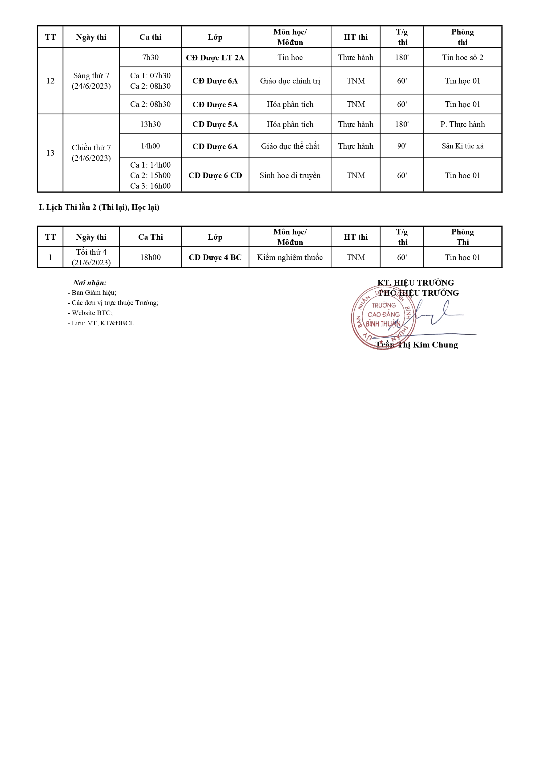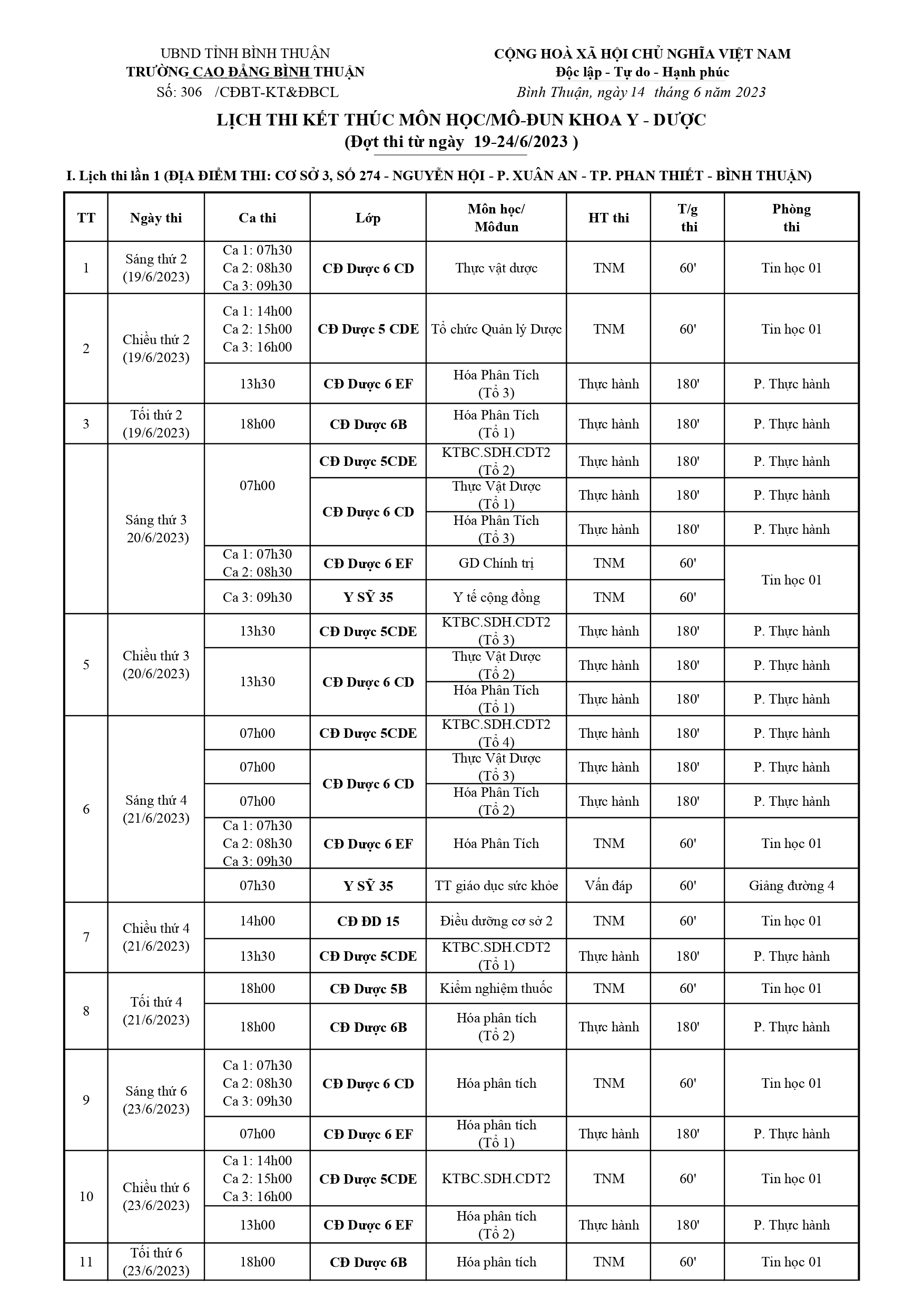 LỊCH THI KẾT THÚC MÔN HỌC/MÔ-ĐUN KHOA Y - DƯỢC (Đợt thi từ ngày 19-24/6/2023)