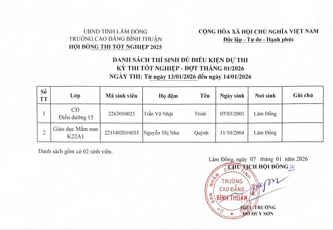 DANH SÁCH ĐỦ ĐIỀU KIỆN DỰ THI TỐT NGHIỆP - ĐỢT THANG 01/2026