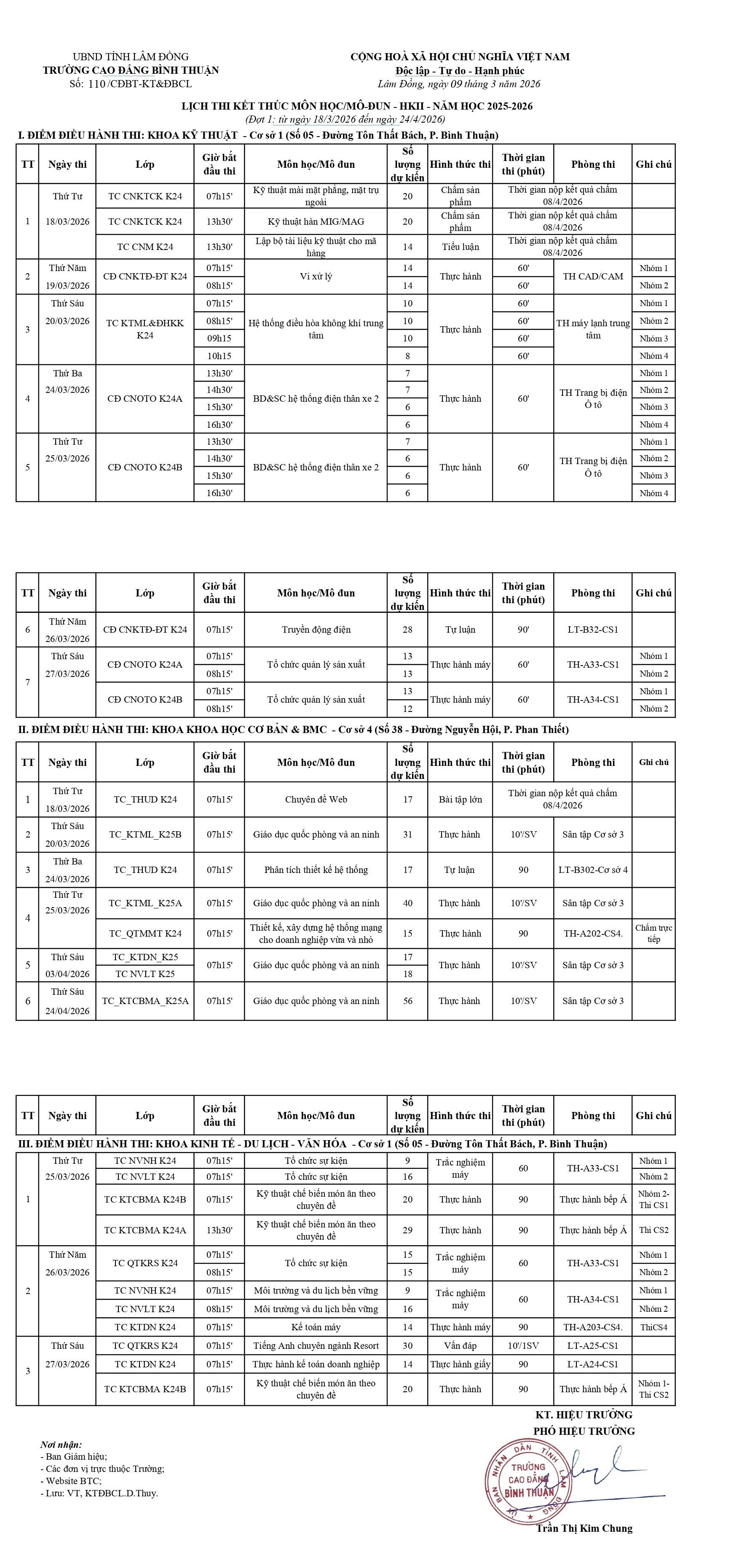 Lịch thi kết thúc môn học HKII, đợt 1, năm học 2025-2026 của các khoa (từ ngày 18/3/2026 đến ngày 24/4/2026)